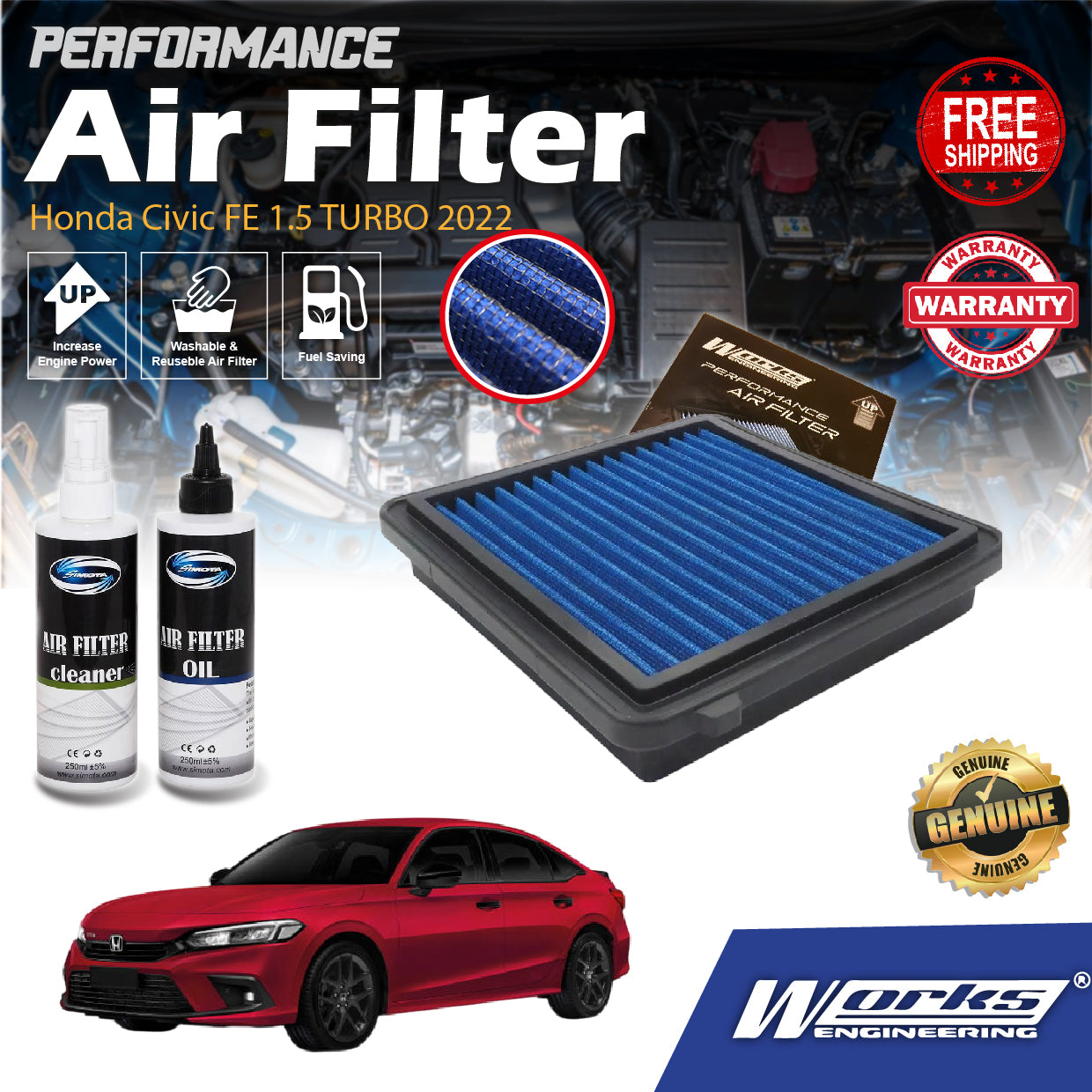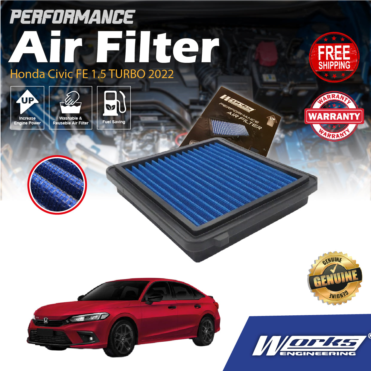 Honda Civic FE 1.5 TURBO 2022 Works Engineering Drop In Air Filter WS-RH-006 PERFORMANCE Enjin Engin Penapis Udara POWER