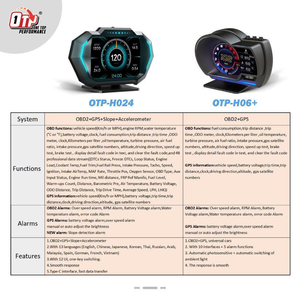 Features:OBD+GPS + Slopemeter + Ambient Light (Blue, Red, Purple Switch) + 12 Language Settings (English, ChineseChinese Simplified Traditional, Thai, Japanese, Korean, Russian, Arabic, Malaysian, Spanish, German, French) + 12 grids + Added accelerometer G-value table"