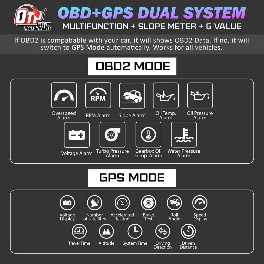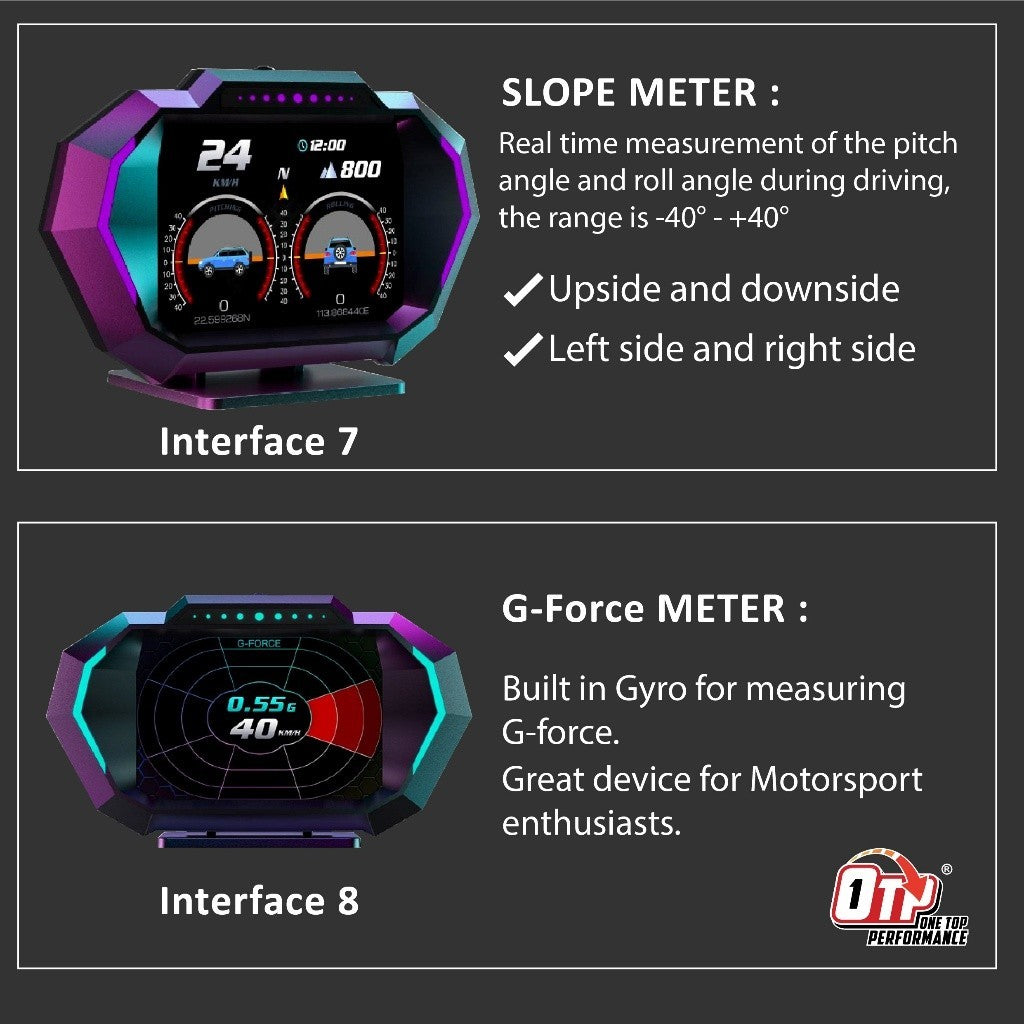 Features:OBD+GPS + Slopemeter + Ambient Light (Blue, Red, Purple Switch) + 12 Language Settings (English, ChineseChinese Simplified Traditional, Thai, Japanese, Korean, Russian, Arabic, Malaysian, Spanish, German, French) + 12 grids + Added accelerometer G-value table"