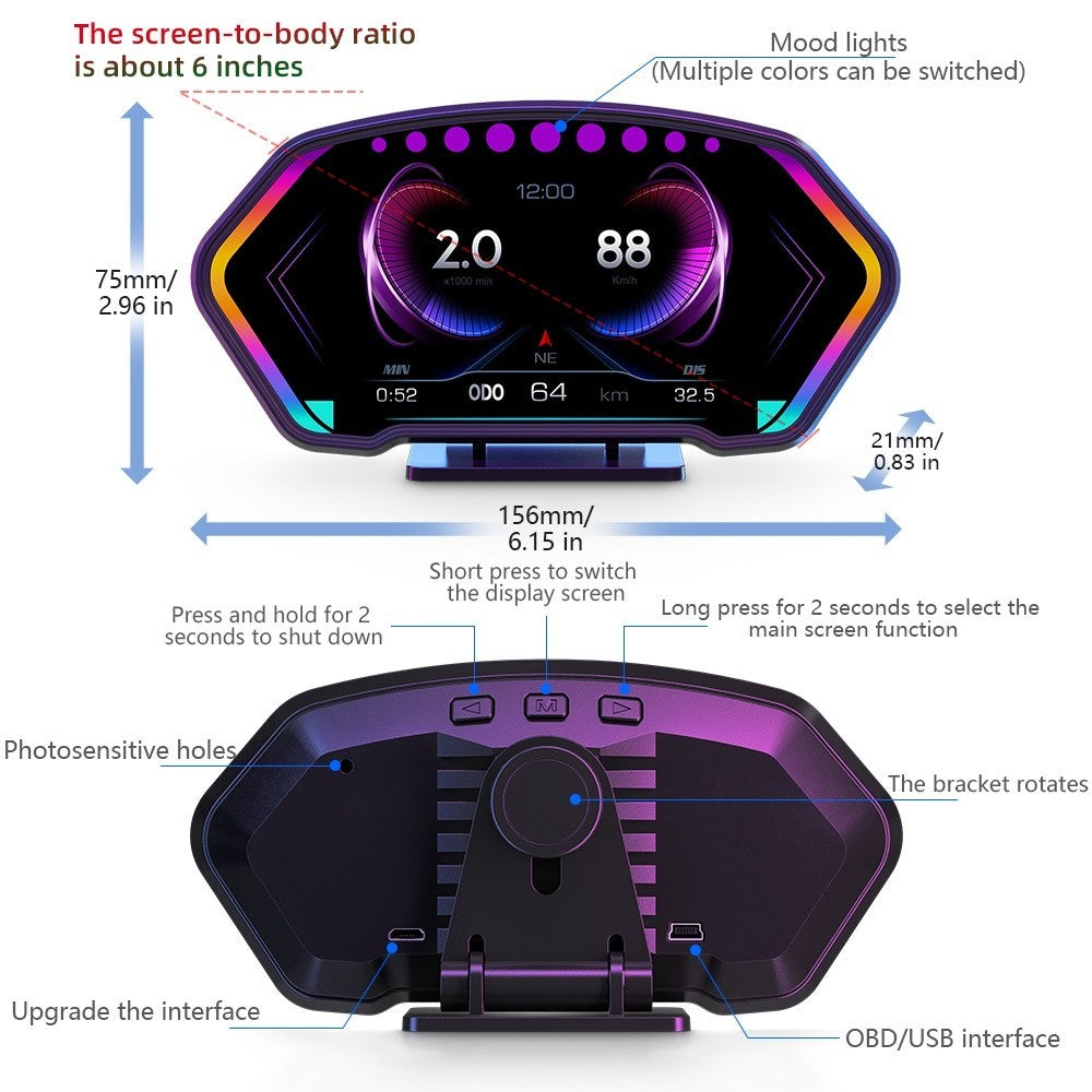 OTP-H024 P3 OBD2 Meter Gauge Meter Car GPS Alarm Speed Head-Up LCD display Water temp RPM Turbo Boost HUD engine status