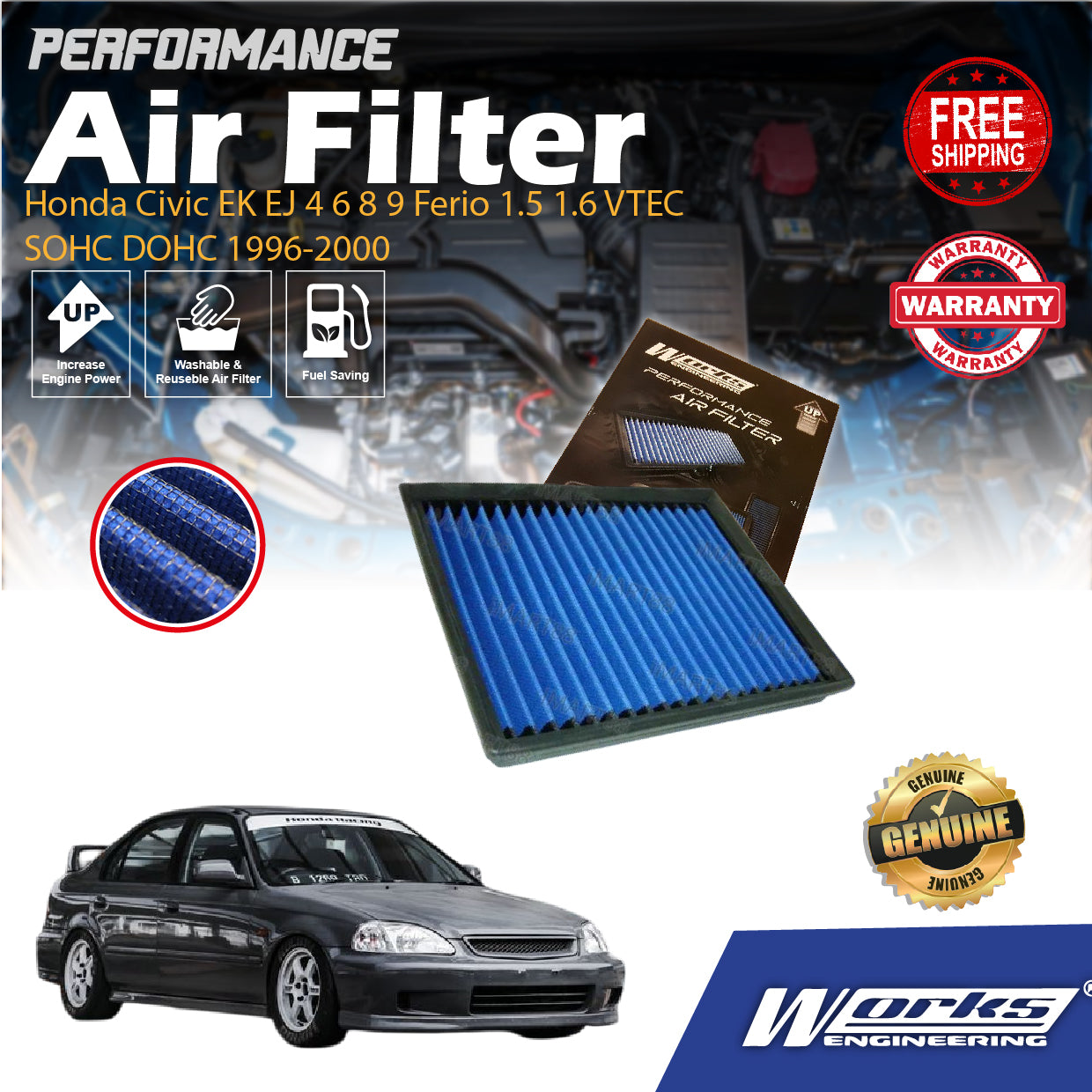 Works Engineering Air Filter Honda Civic EK EJ 4 6 8 9 Ferio 1.5 1.6 VTEC SOHC DOHC 1996-2000 Filter Cleaner Oil