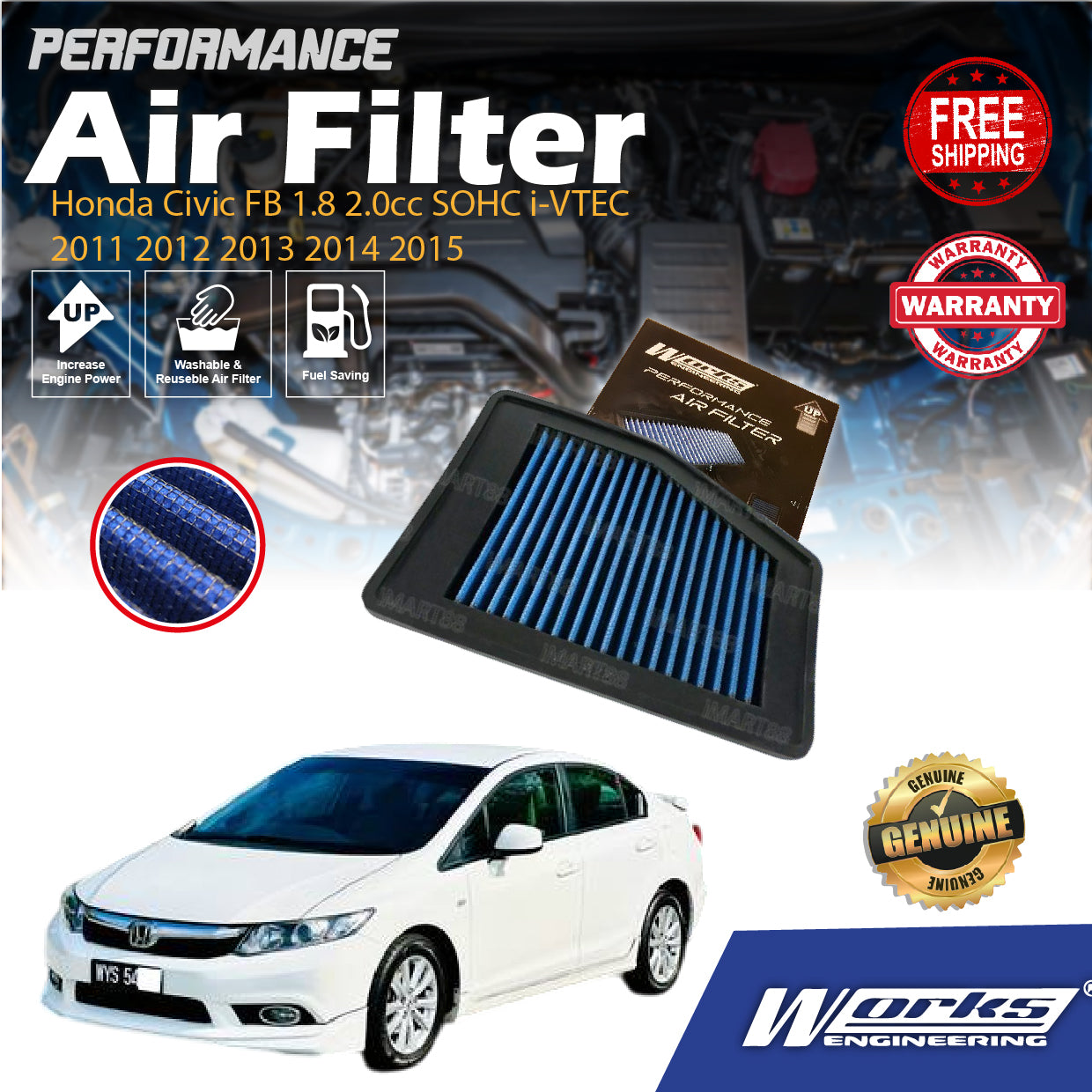 Works Engineering Air Filter Honda Civic FB 1.8 2.0cc SOHC i-VTEC 2011 2012 2013 2014 2015 Filter Cleaner Oil