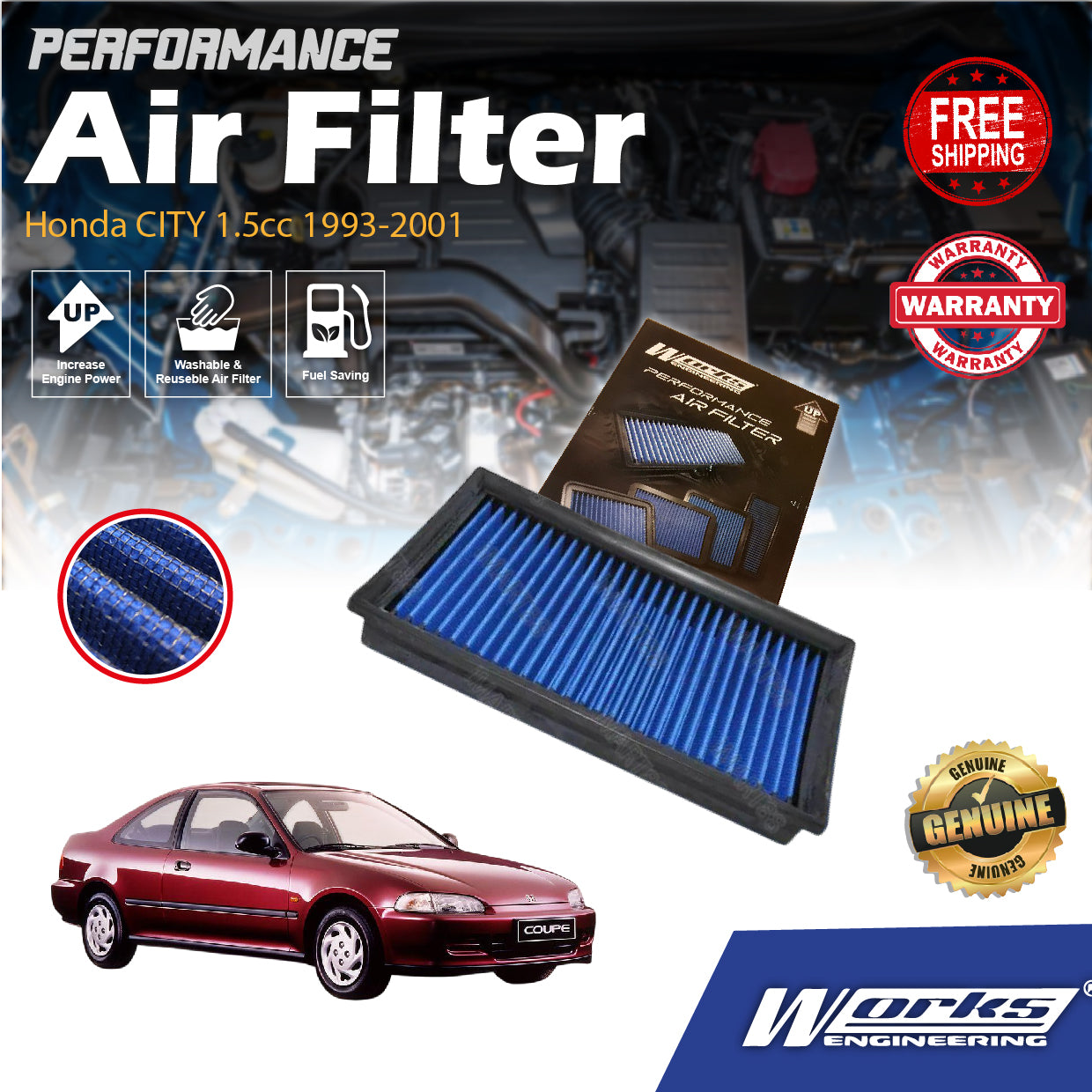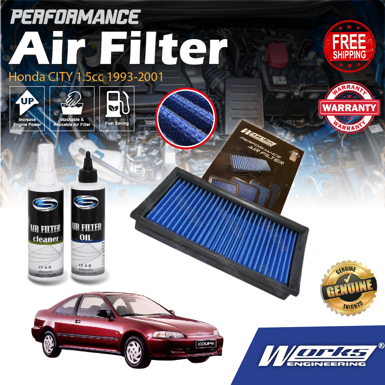 Works Engineering Drop In Air Filter Honda CITY 1.5cc 1993-2001 Element Enjin Engin Penapis Cleaning Oil