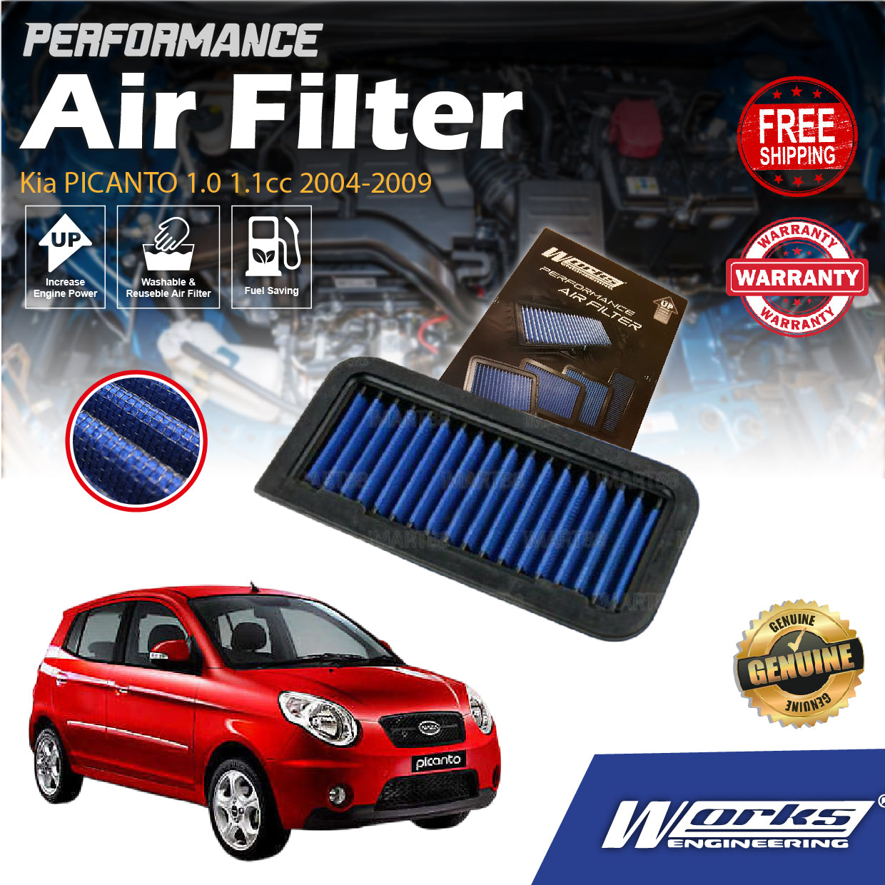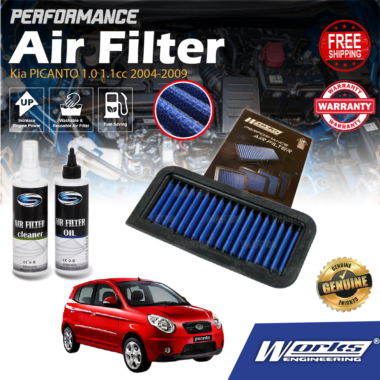 Works Engineering Drop In Air Filter Kia PICANTO 1.0 1.1cc 2004-2009 Element Enjin Engin Penapis Cleaning