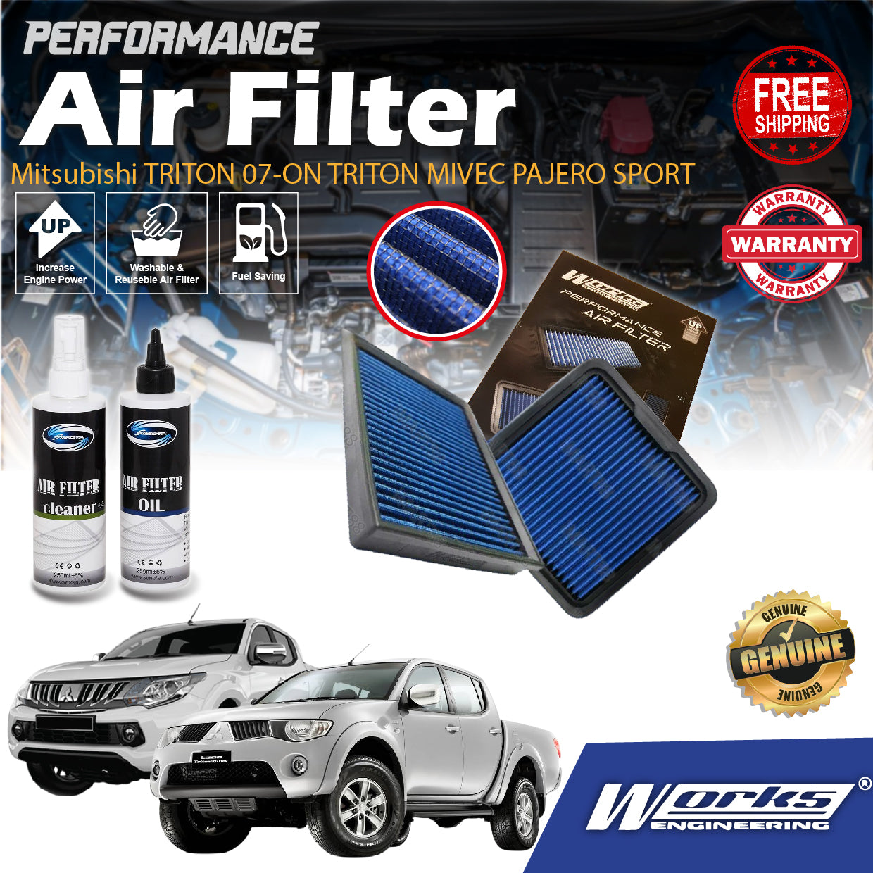 Works Engineering Drop In Air Filter Mitsubishi TRITON 07-ON TRITON MIVEC PAJERO SPORT 2016-2018 Element Enjin Engin